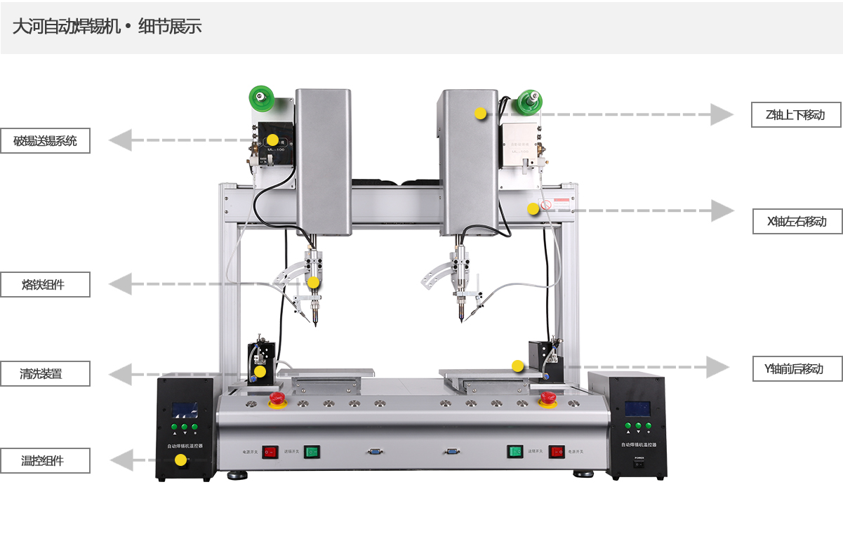 2.采用多軸機械手及先進運動控制算法進行聯動,模擬人手加錫動作,有效提高烙鐵頭的定位精度。